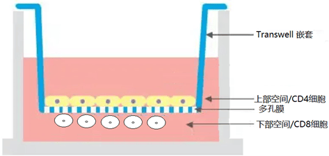 培养板里有一个可以拿下来的带滤膜的小皿(Transwell嵌套),把培养板分成上下两部分,CD8+ T细胞在下部空间,CD4+ T细胞在上部空间,两种细胞不接触也不能穿透,但细胞产生的物质可以穿过滤膜。