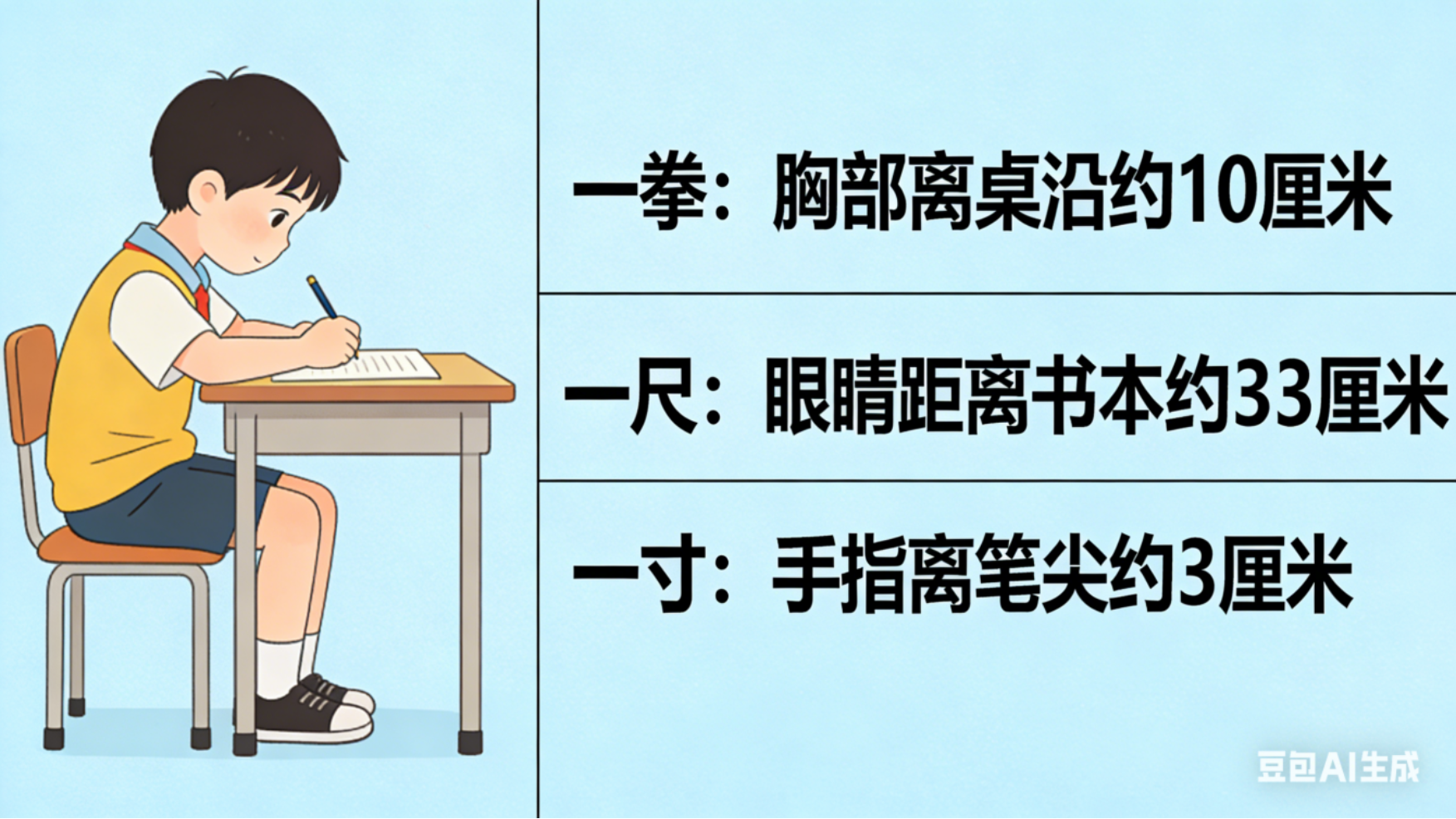 读写时注意身体坐正,坚持“一拳一尺一寸”标准,即:胸前与桌子距离约一拳(约10厘米),眼睛与书本距离约一尺(约33厘米),握笔的手指与笔尖距离约一寸(约3厘米)。