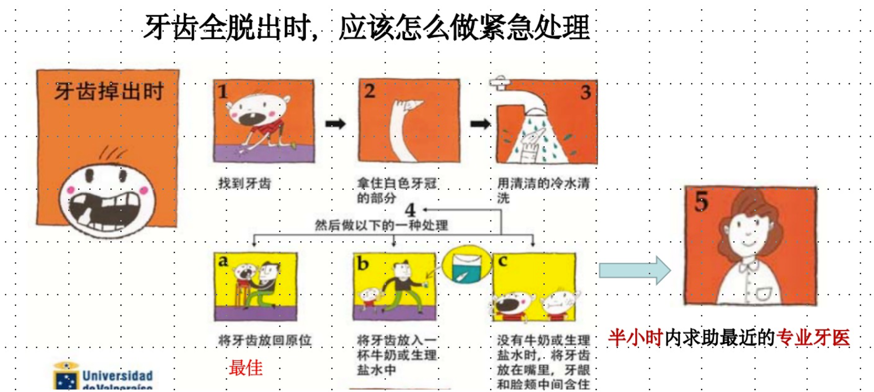 如果在日常生活中由于碰撞、摔跤等原因不小心导致牙齿整颗脱离,请立即按照以下的流程处置进行牙齿急救:1.快速找到牙齿;2.只捏住牙冠(暴露在牙龈外的牙齿部分);3.在水龙头下用冷水冲洗干净;4.放置牙齿:(1)首先选择将牙齿放回原位,(2)如果没有办法放回原位,可泡在牛奶或生理盐水中,(3)没有牛奶或生理盐水时,将牙齿放在嘴里,牙龈和脸颊中间含住;5.务必在30分钟内就医。