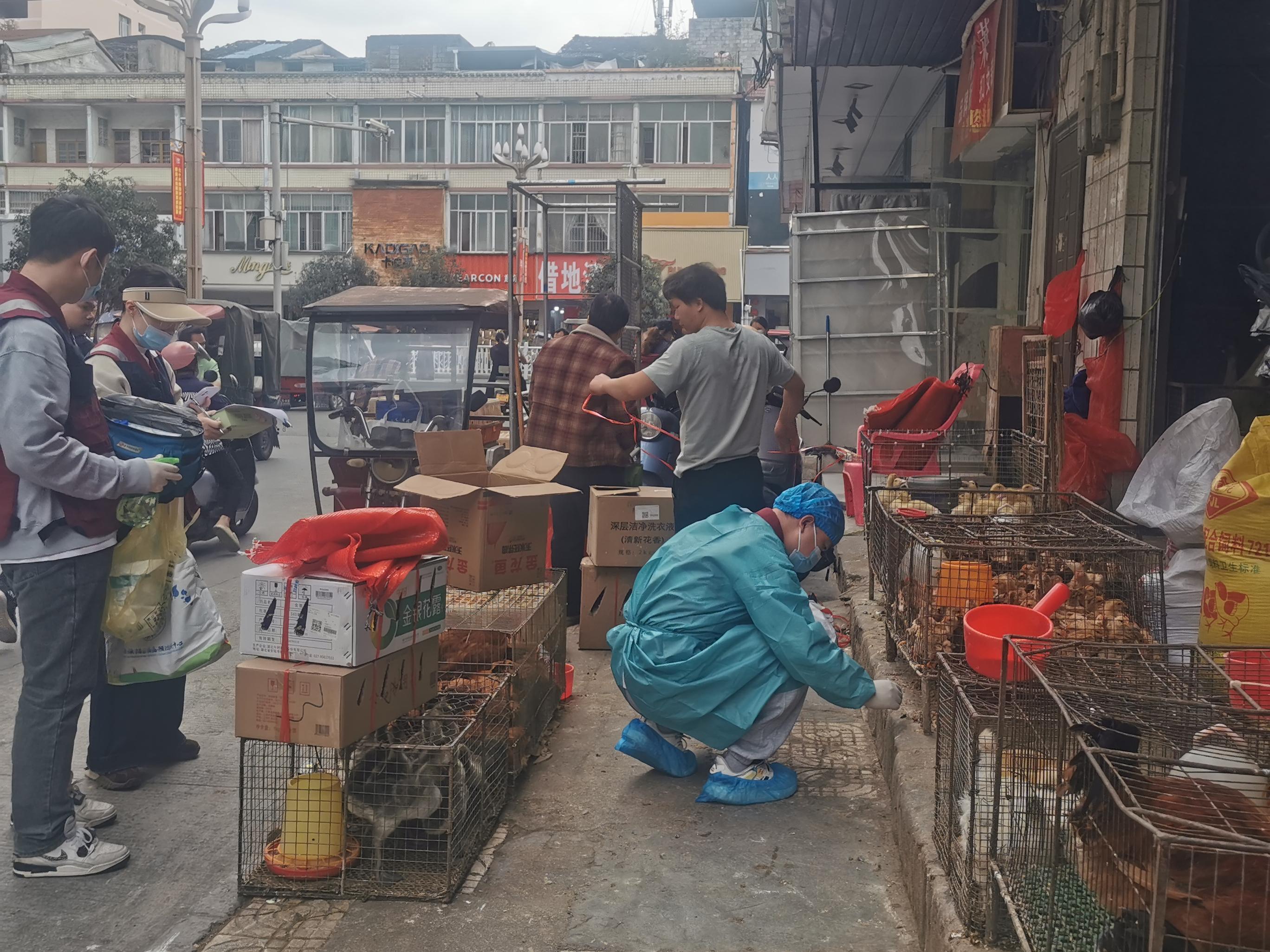 工作人员在活禽交易市场采集外环境标本
