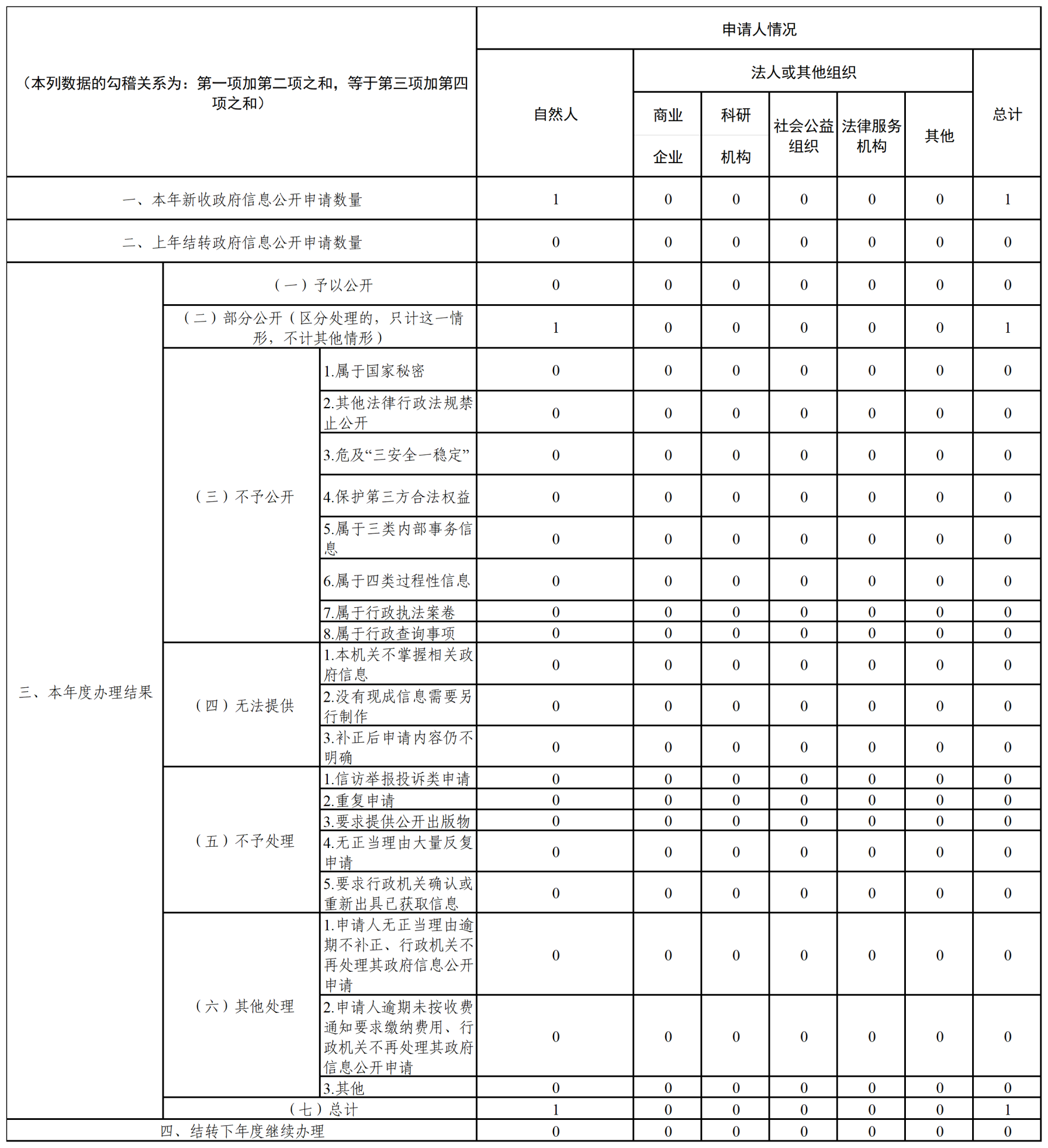 (二)依申请公开方面。健全“收件标准化、办理协同化、答复精准化”工作体系,完善从登记、分办、会商到答复、归档的全流程管理机制,加强与申请人的沟通对接,精准把握需求、规范高效办理,切实保障申请人合法权益。全年收到政府信息公开申请件1件,办结1件(部分公开)。