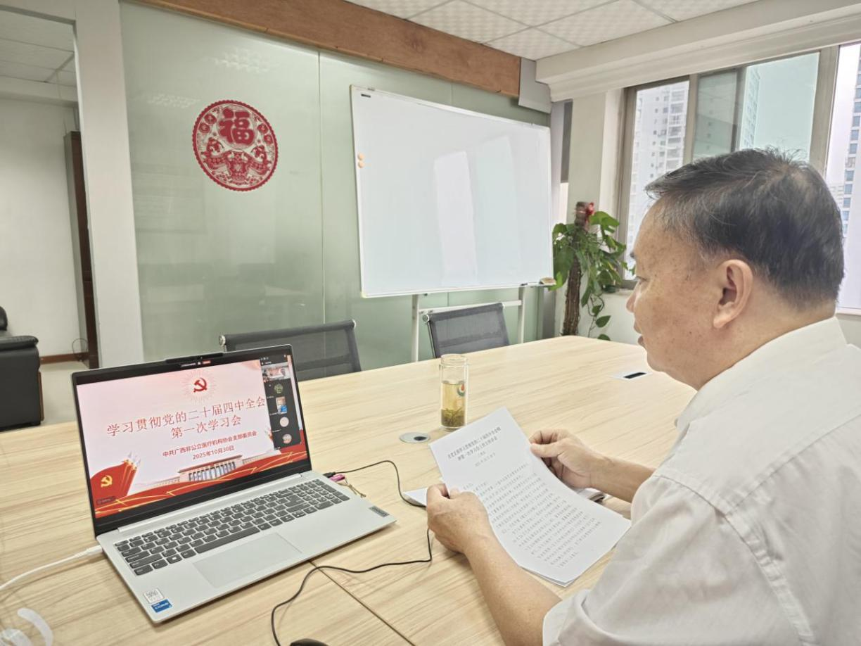 2025年10月30日,广西非公立医疗机构协会党支部采用线上集中学习方式召开学习贯彻党的二十届四中全会精神第一次学习会,会议由党支部书记王建政主持,全体党员参会。